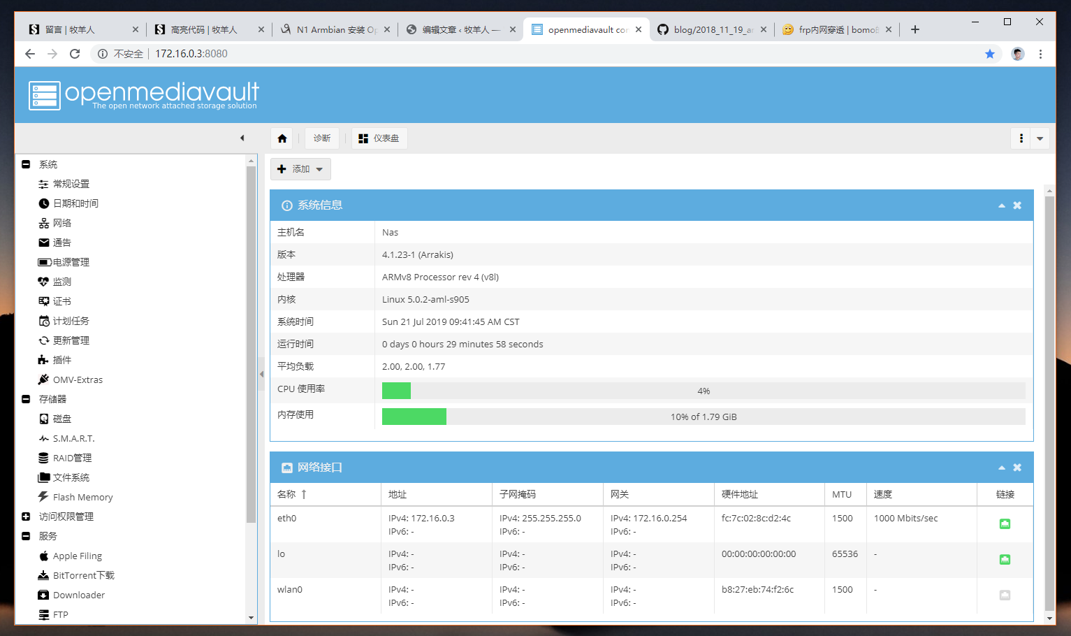 armbian-config经过一段时间安装完成后,在浏览器打开 N1 的地址,输入预置的用户名密码admin/openmediavault即可登入 OMV 的管理页面。熟悉后台之后建议第一步工作先更改管理页面端口和密码,后台管理页面清爽,各个模块简单明了,支持中文,上手很快。