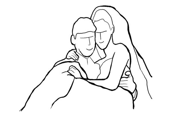 4、亲切又轻松的姿势,两人面颊相贴,互相抱住面向镜头,同时新娘手拿鲜花。