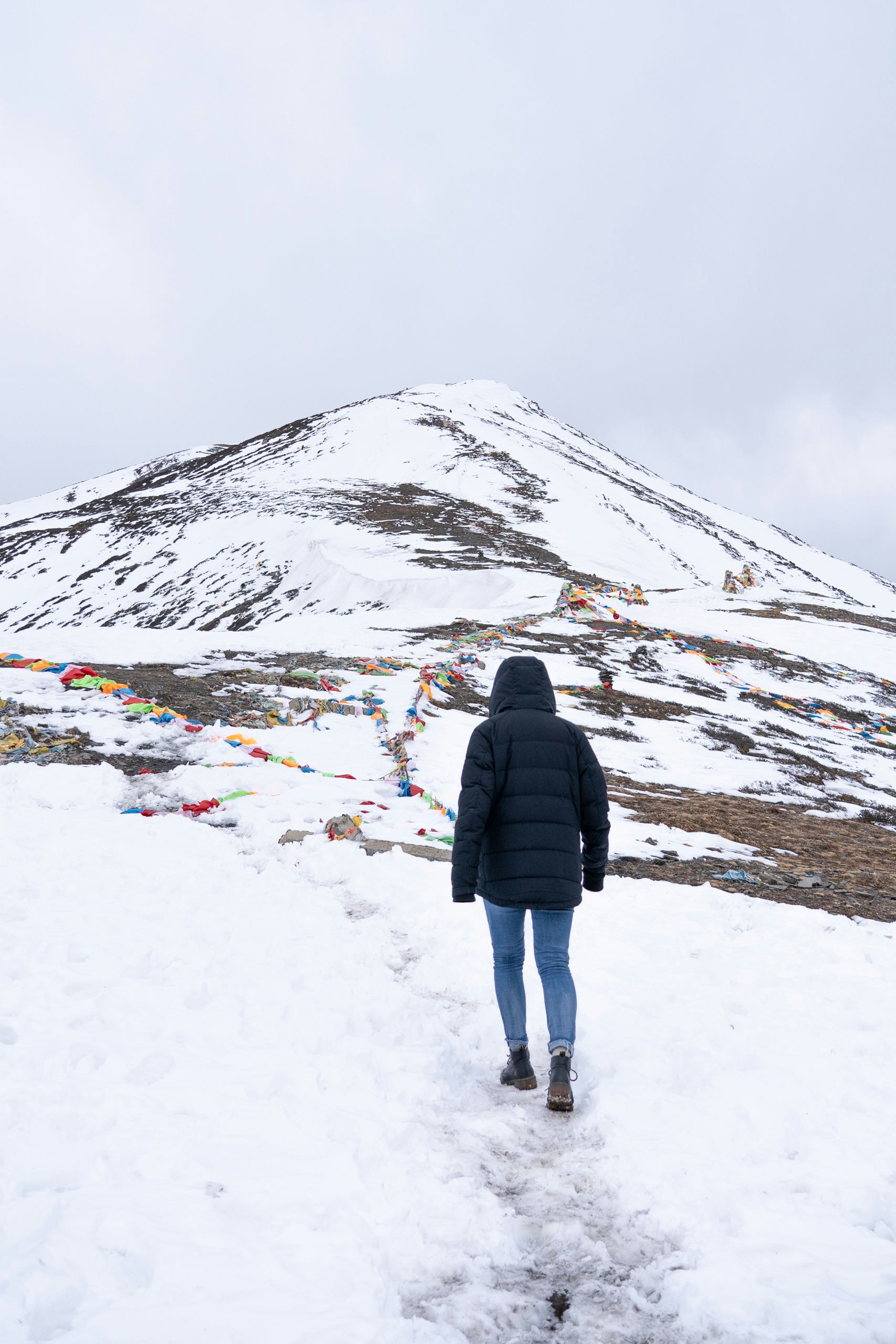 在折多山垭口,我们把车停在路边,开始了本次旅行的第一次登高。其实从上图你就看得出来,这登山的路很难走,异常湿滑。包括我在内的很多人都滑倒在了这长长的雪道上,所以绝大多数人都止步于半程的平台(上图居中位小尖塔处),慑于寒风和高反,及时下山。但我和小兮兮心有不甘,决定再爬一程,一直到了我们人眼能看到的最后一个峰脚下(上图右上侧第二个山峰)。