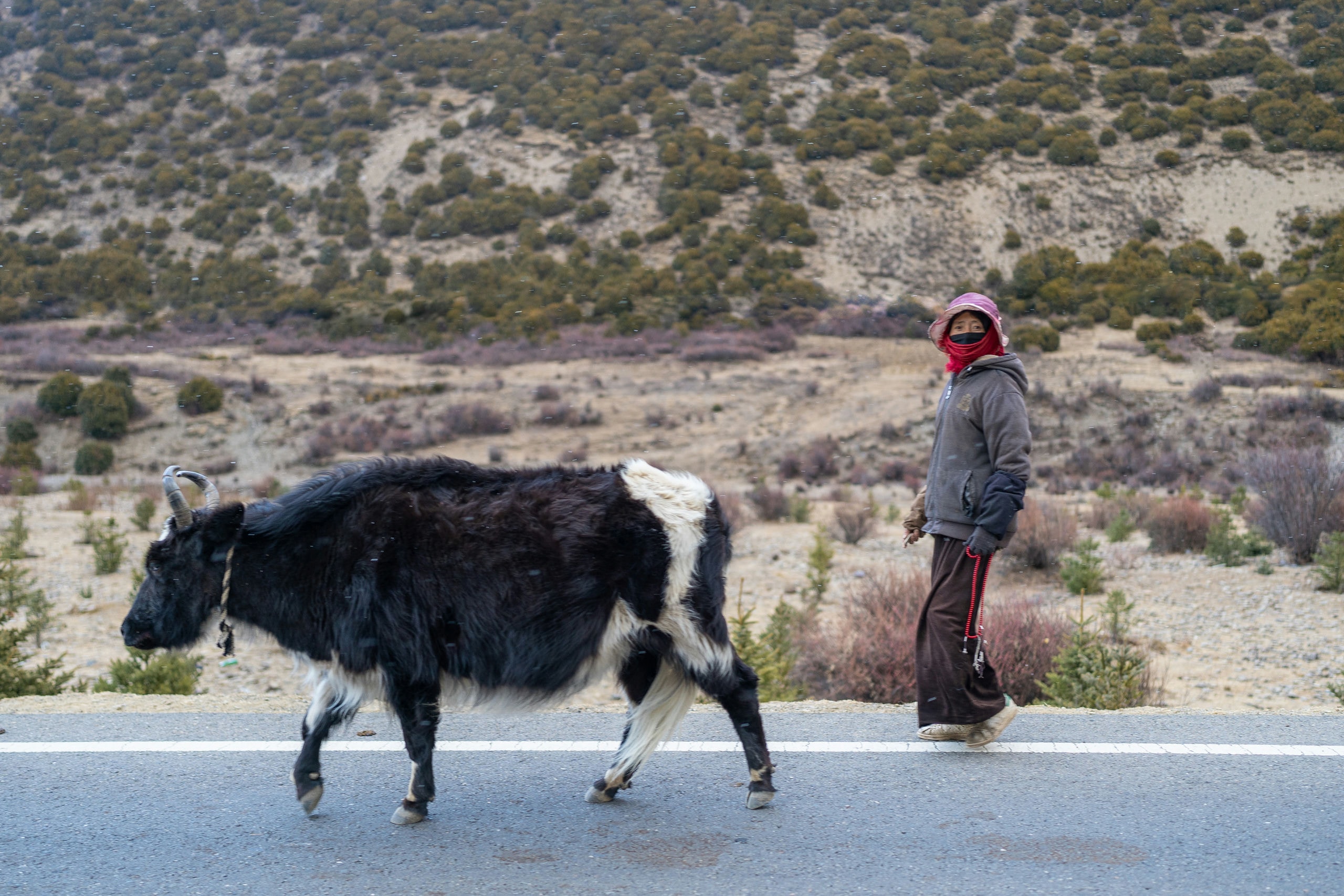 理塘放牛的女人,去往香格里拉镇的路上已经下起了小雪