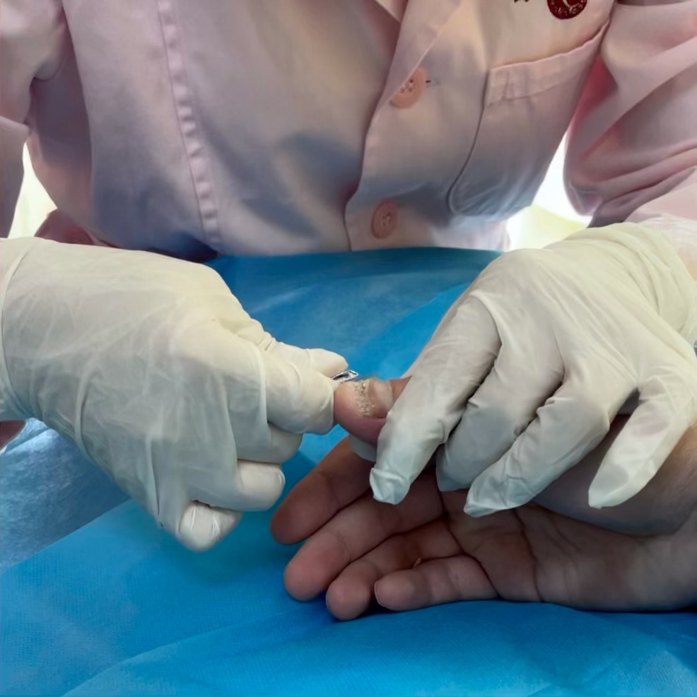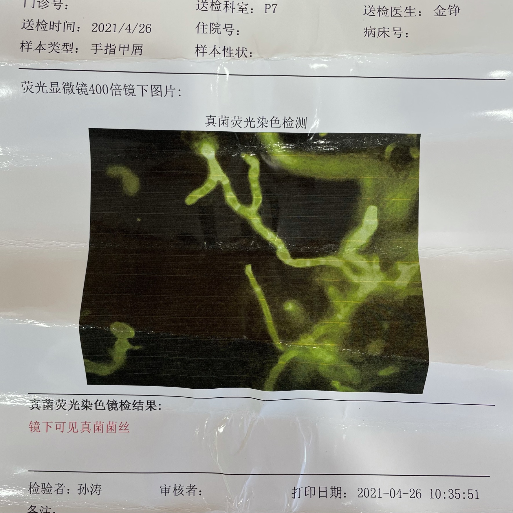 百度找了个就近的皮肤科医院做了检查,果然可见真菌感染,于是询问医生之后开始治疗。先是用药水泡,这一步的工作应该是基本清洁然后软化指甲,然后护士姐姐给修掉可以无痛削掉的残甲,接着抹上专用的药膏并包好,一次用药可持续三到五天,这药主要是杀菌。接下来的几周循环这三个步骤,一直到坏甲去除新甲长出即可。