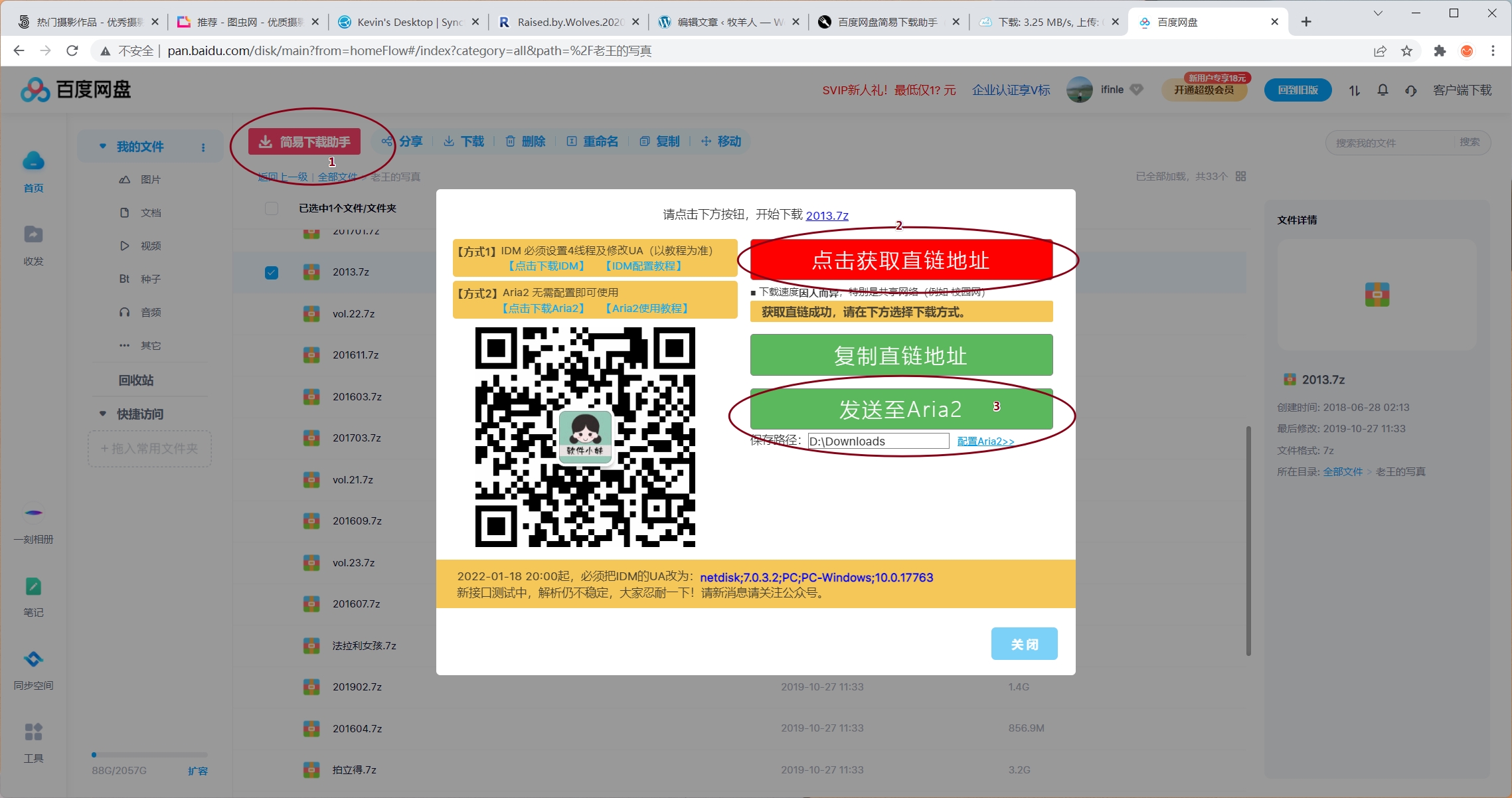 而本文提到的 Aria2 则是一款非常优秀的 http 下载器。首先你需要是 Tampermonkey(油猴)用户,然后在脚本库安装 百度网盘简易下载助手(直链下载复活版),这时候打开百度网盘(网页版)选中需要下载的项目已经能看到“简易下载助手”,单击它获取直链,再按导入到 Aria2 就可以啦~