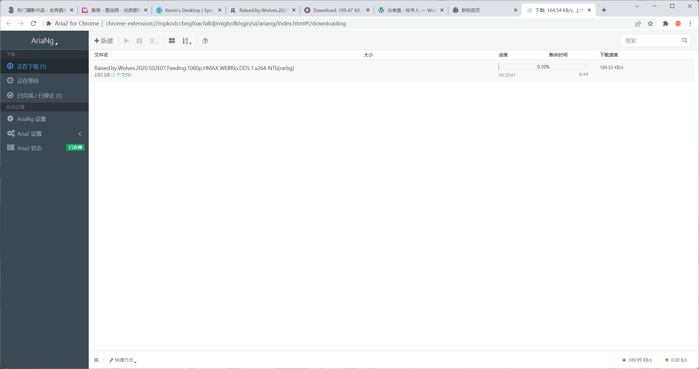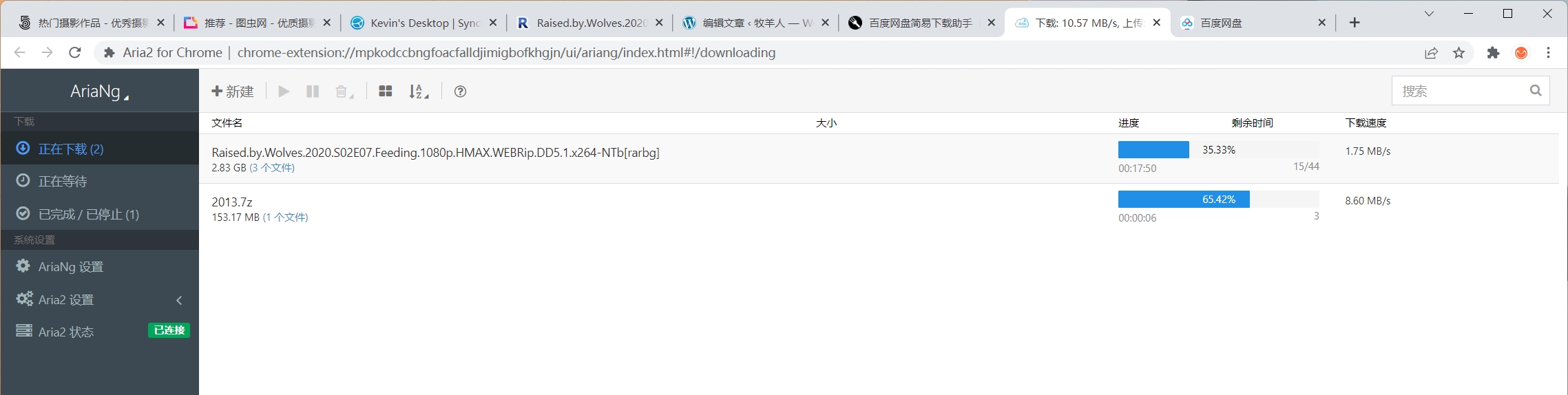运行启动器后,被关联的 Aria2 主程序被同步启动(任务栏进程),同时 AriaNg/Aria2c主界面显示“已连接”。从界面上可见它和其他下载软件区别不大,相信聪明的你一看就会,就不再赘述了。值得一提的是由于系统权限等的原因,在页面设置里边修改相关参数可能不会生效——如果实在要改,请打开aria2.conf文件直接修改: