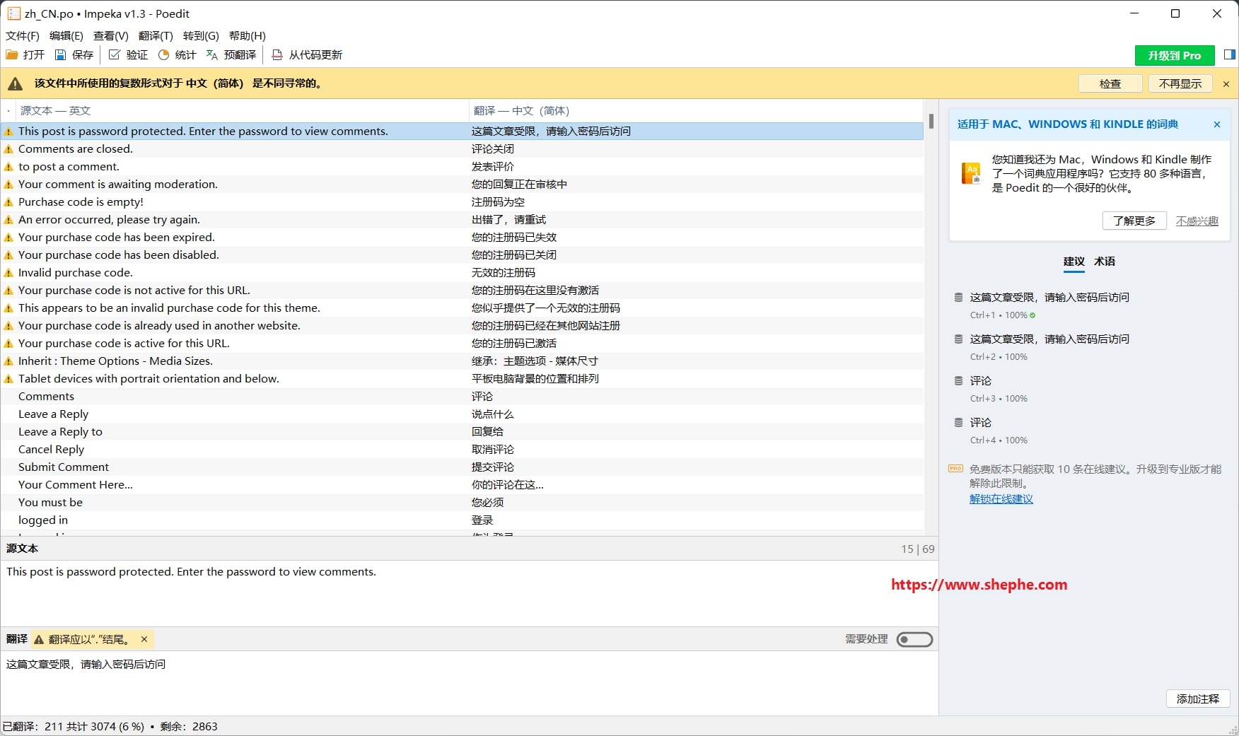 人工翻译固然准确、个性化一些,但是遇到如我这样的长达15000行的语言包,其中需要翻译的项就有3100项,这就很要命了!于是,它来了:Poedit——一个强大、直观的翻译软件。基本上这软件就是为翻译语言包而生的,包括但不限于Wordpress主题、插件及其他程序的语言包。
