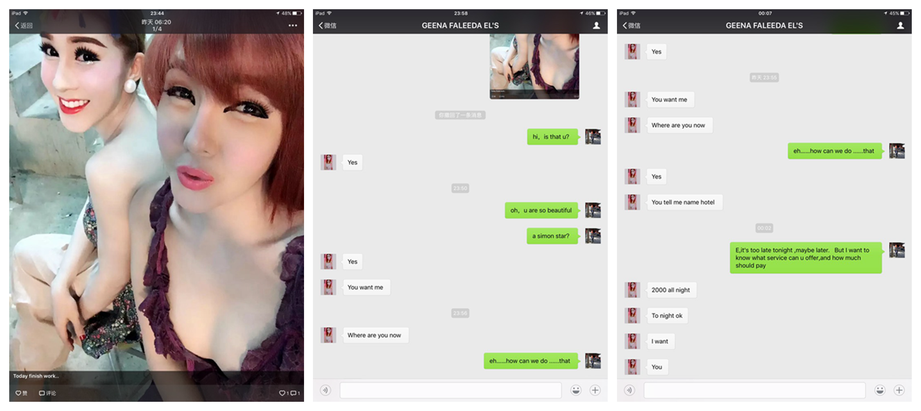 我一个同事信以为然,在和一个 Ladyboy 合影过后,那人递给他一张纸条:Wechat:XXXX。于是同事和这位人妖进行了长达一周的文字及视频电话聊天,同事一度认为自己第二春就要来了,并自觉愧对于苦守家中的妻女……然而只有我的火眼金睛识别到:这只是个操着半生不熟英文的异种性工作者而已。