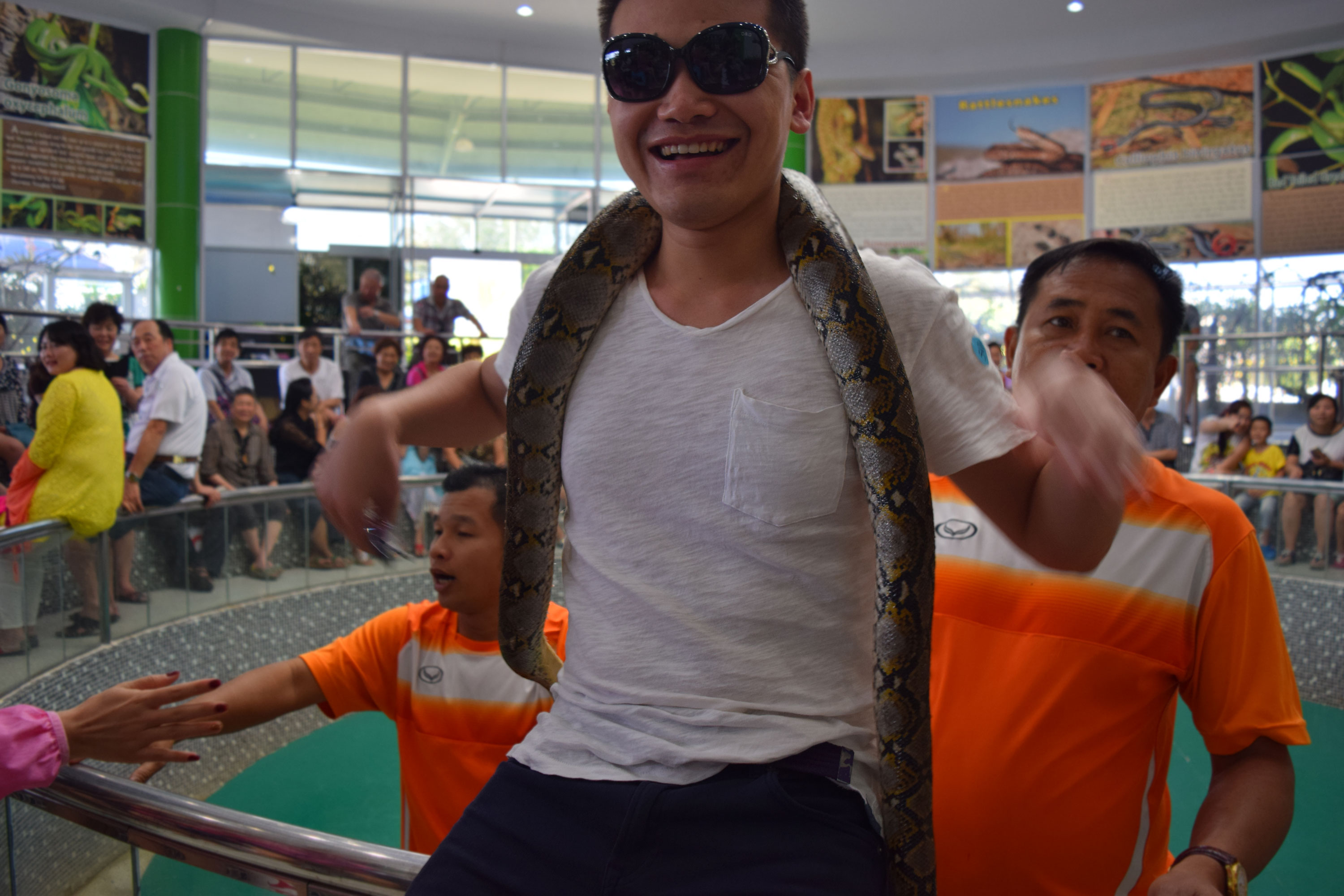 这是“人蛇大战”。同一天的上午在曼谷一个相似的地方,一中国女游客“蛇吻”被咬伤(新闻链接),事发场面恐怖,众人震惊!而大胆如我竟然也想去吻一下…幸好没去。另外成年的金刚王蛇真是霸气侧漏!
