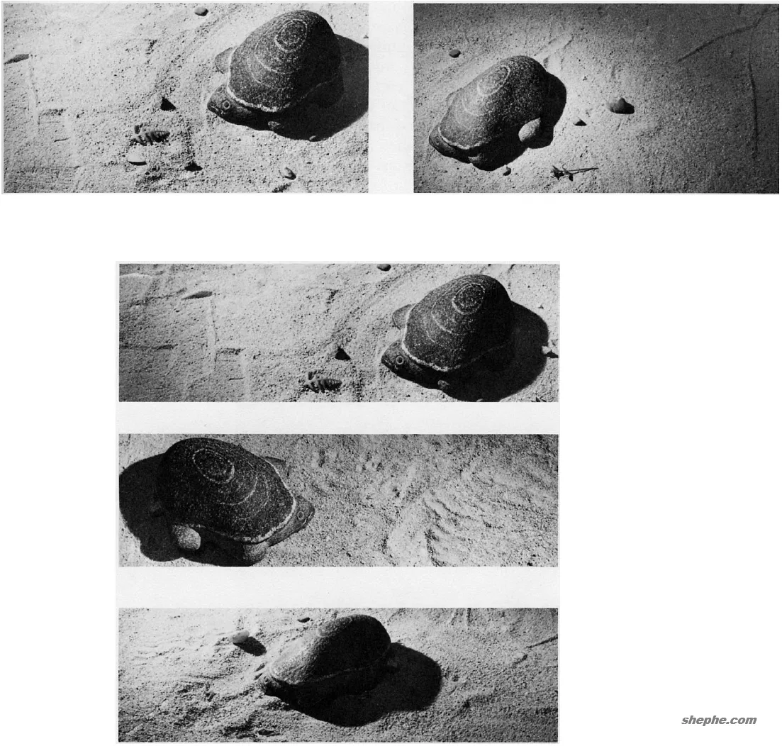 首先,我们来考虑一下,把一个稍暗的物体衬在一个简洁明亮的背景上应该怎样布局。这里,我们采用已故雕刻家阿尔比诺卡瓦利托的石雕海龟作为试验的对象。为了便于作试验,把石雕放在沙盘上,沙上放些淡颜色的卵石和树叶使质感有所变化。试验时只拍一张底片,要给海龟四周留出充足的余地,以便在各个方向进行剪裁。