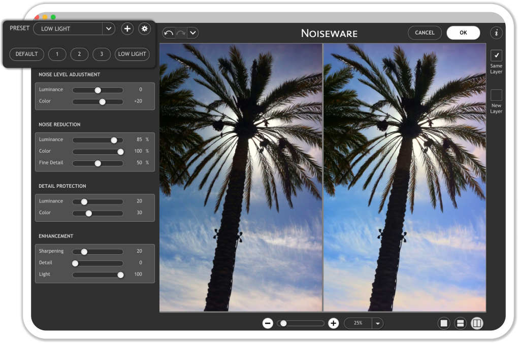 该插件支持多种图像处理软件,如 Adobe Photoshop 和 Lightroom,操作界面直观友好,无论是业余用户还是专业人员都能轻松上手。Noiseware 还提供了多种预设和自定义选项,以满足不同类型照片的降噪需求,用户可以根据具体情况自由调整参数达到最佳效果。