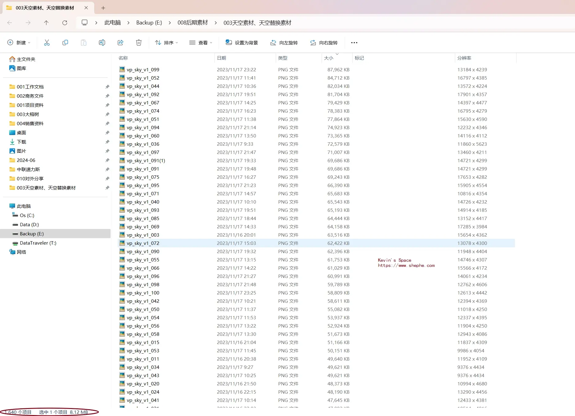 总之,Photoshop 换天既是技术也是艺术,它能够弥补拍摄现场的不足,将最理想的天空效果呈现在观众面前。无论是专业摄影师还是普通爱好者,只要掌握了这一技巧,都可以创造出令人惊叹的视觉作品。不过 Photoshop 软件中内置的图像素材比较少,来来回回就那么几幅。本文所提供的天空替换素材总共有超过 1600 幅 Jpeg/Png 图像,几乎涵盖了任何形式的天气、颜色和分类,是 Kevin 多年收藏整理所得,其分辨率从 1600x1200 到 13184x4239,没有任何水印,可以满足你各种需要!