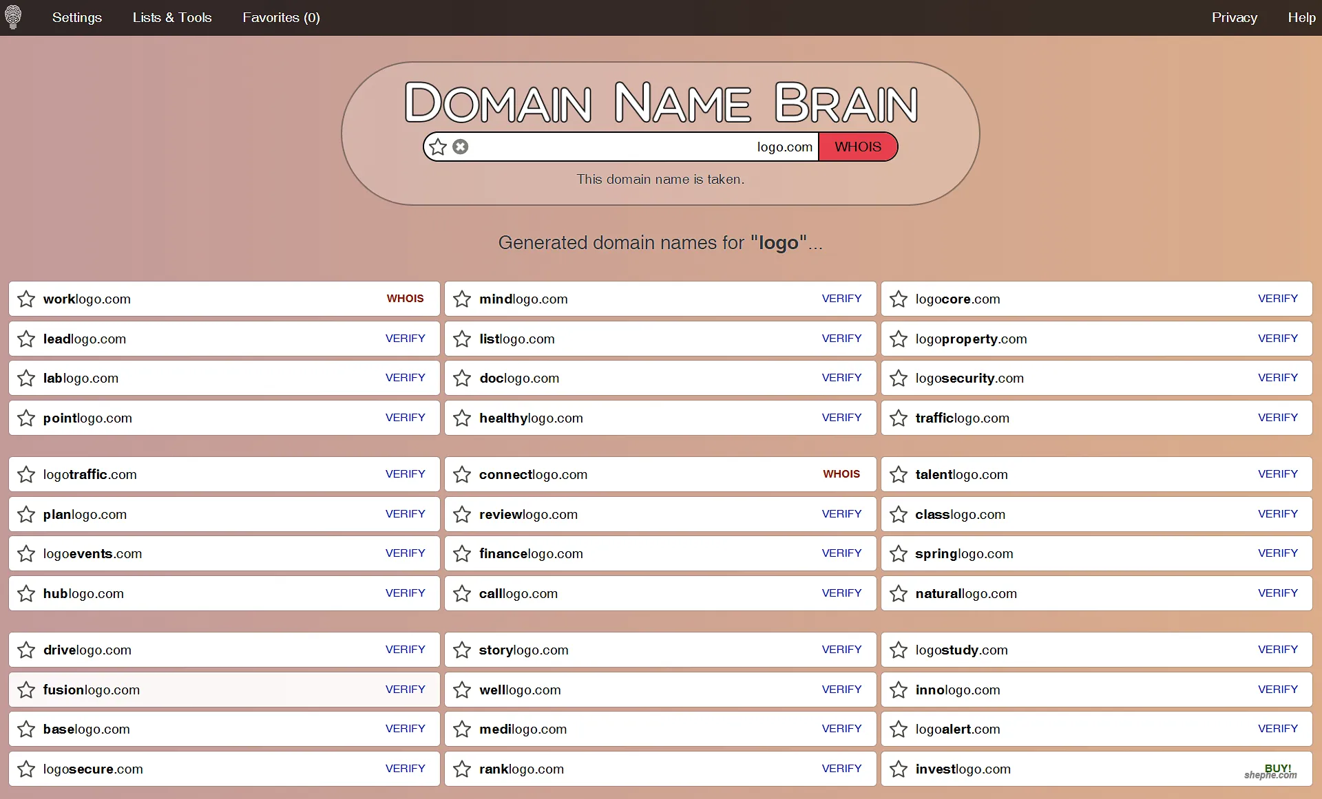除此之外,网上还有一些专门的域名实用工具。这里我重点推荐两个免费的在线工具:Lean Domain Search 和 Domain Name Brain。它们都能快速检索并扩展你的核心关键词,瞬间生成成千上万个域名组合,而且全程无广告,使用体验非常好。以下是以logo为例检索生成的结果: