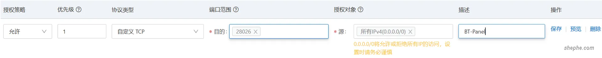 以阿里云为例,我们登录后依次进入云服务器 ECS - 实例 - 安全组 - 管理安全组(默认只有一条),在目的一栏中输入须开放的端口28026,源端口设置为所有0.0.0.0/0,输入说明后保存即可。