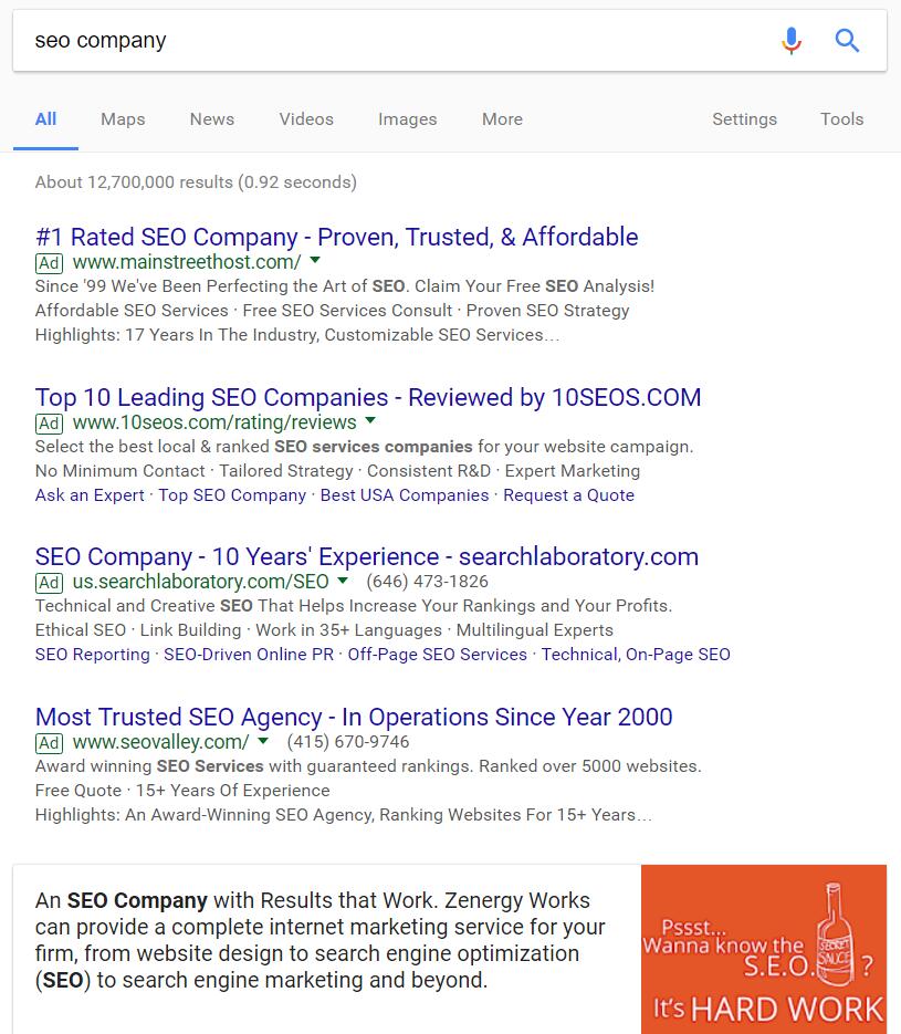基于第一个事实,为了增加公司营收,2016 年 Google 搜索结果页的广告位置从以前被严格限制在三条内变成四个,并取消了右侧的广告位。这年头,不光是 SEO 行业竞争激烈,连关键字竞价也是火海一片。搜索关键字“seo company”,结果如下: