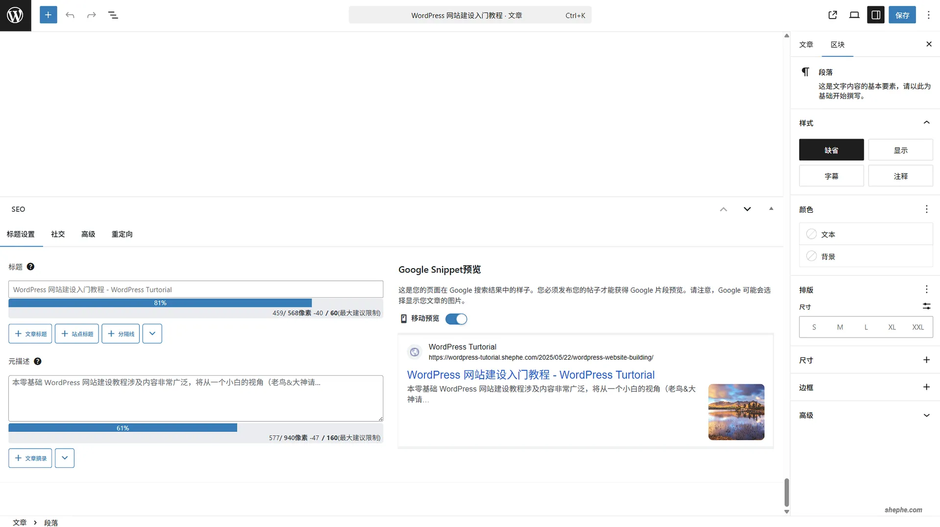如果你在设置中开启了元框显示功能,进入文章或页面编辑器时,会发现右下角多了一个小图标按钮(默认位置在右下角)。这是 SEOPress 提供的快捷入口,你也可以通过拖拽将它移动到更合适的位置,符合自己的使用习惯。点击这个图标后,会弹出一个浮动面板,分为两个主要模块:
