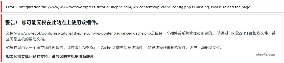 以上就是典型的文件权限冲突问题。如果确认 /wp-content/ 文件夹及相关文件权限本身没有问题(如设置为 755 或 775),那么很可能是之前安装的其他缓存插件未卸载干净所致。此时可以尝试通过 FTP 手动删除 /wp-content/advanced-cache.php 文件,然后重新启用 WP Super Cache 插件。
