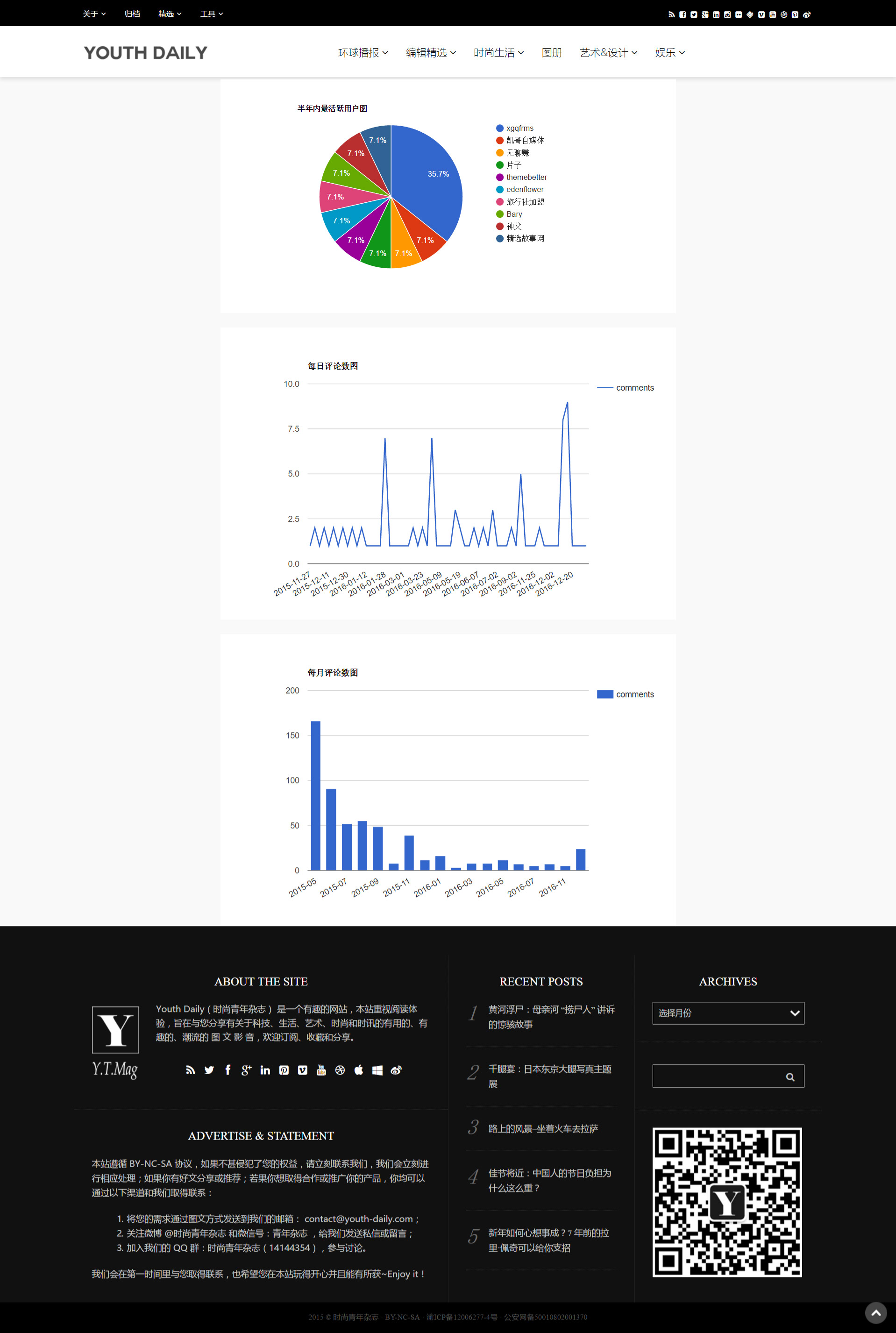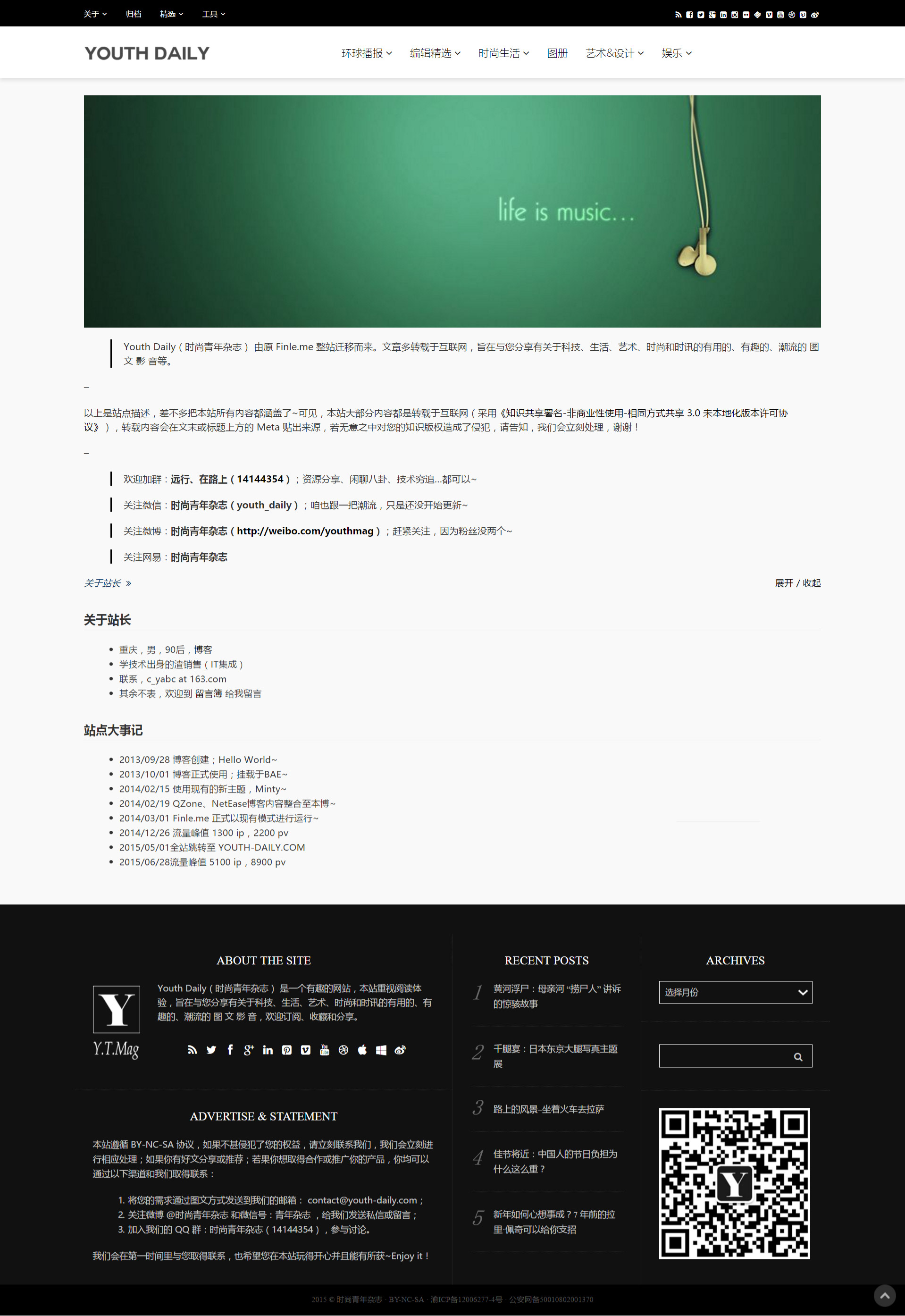 我的个人站墓志铭(Youth Daily) 04/08/2024 更新 25 条评论 网站建设 311 字 15,229 阅读 文章目录文章目录#首页#文章详细页#相册详细页#关于页面#评论统计#相册目录#网易订阅近三万;一点也有不少粉丝;微信又少量关注;微博三千粉……#最开始是 FINLE.ME 域名时候设计的海报…… 时光不予,深情不待,我曾用心耕耘的一个 Web 最终还是停止更新,打算就近两天关站了……烟花散去无人泪,徒留站长自唏嘘啊!回忆往昔,只觉胸闷不舒有话却又吐不出,便截些图以作留恋吧。 #图片尺寸非常大,请进入内文后单击图片播放或将图片打开到新窗口! #首页 #文章详细页 #相册详细页 #关于页面 #评论统计 #相册目录 #网易订阅近三万;一点也有不少粉丝;微信又少量关注;微博三千粉…… #最开始是 FINLE.ME 域名时候设计的海报……